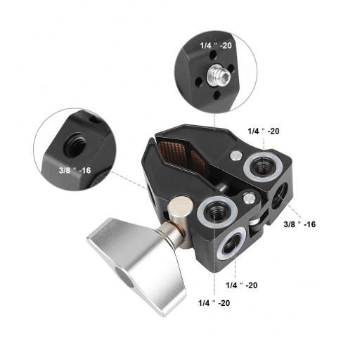 It features 6 of 1/4 threaded holes and 2 of 3/8 threaded holes to meet extension needs, which allows fixing accessories such as articulating arm, ball head, monitor, video light on it.