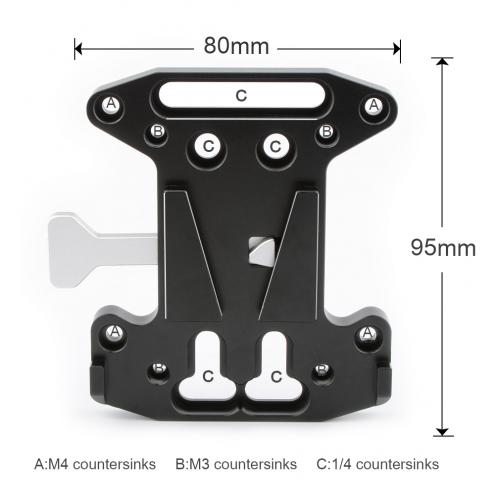 It is a quick release V Mount cheese plate that features plenty of mounting holes and grooves to expand the function of accessory attachment. You can mount the plate to the rod clamp featuring 1/4"-20 female threads, then attach the V-mount battery to supply the power for DSLR, Blackmagic URSA Mini, DJI Ronin M/MX and more. In addition, the V-Lock featuring M3 holes can be used as a replacement of the original V-Lock which comes with the V-Mount battery.