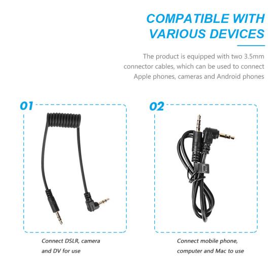 It equipped with two different cables for device connection. A 3.5mmTRS to 3.5mm TRS cable for cameras, and camcorders. A 3.5mm TRS to 3.5mm TRRS cable for smartphones and laptops.
