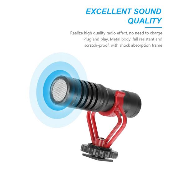 The microphone uses a cardioid condenser capsule which is ideal for minimizing environment noises and focusing the pick up on the subject in front of the mic. An integrated shock mount also reduces handling noise and unwanted vibrations which often ruin audio recordings. The product equipped with a sponge cover suits all kinds of audio production indoors and outdoors.